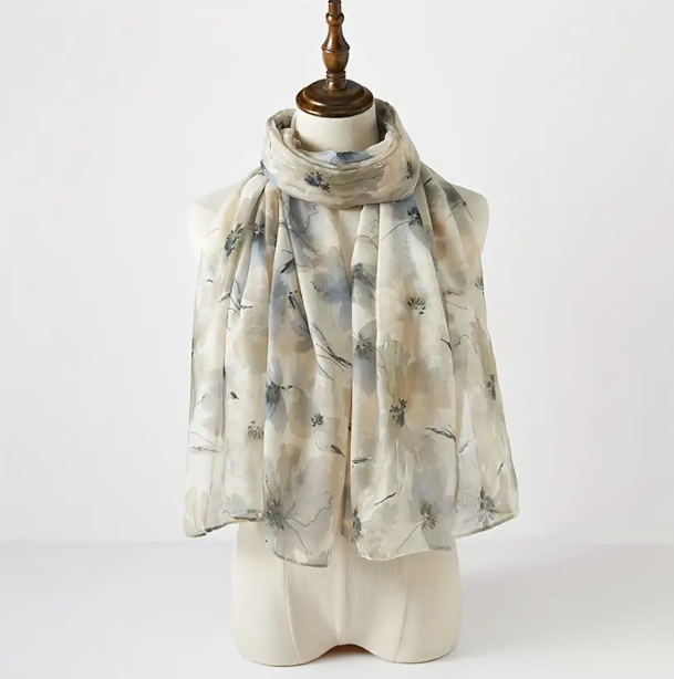 This brown floral scarf with hints of soft blue, is the essence of serenity. This is perfect for spring and summer outfits to bring soft, calming colours to your wardrobe.